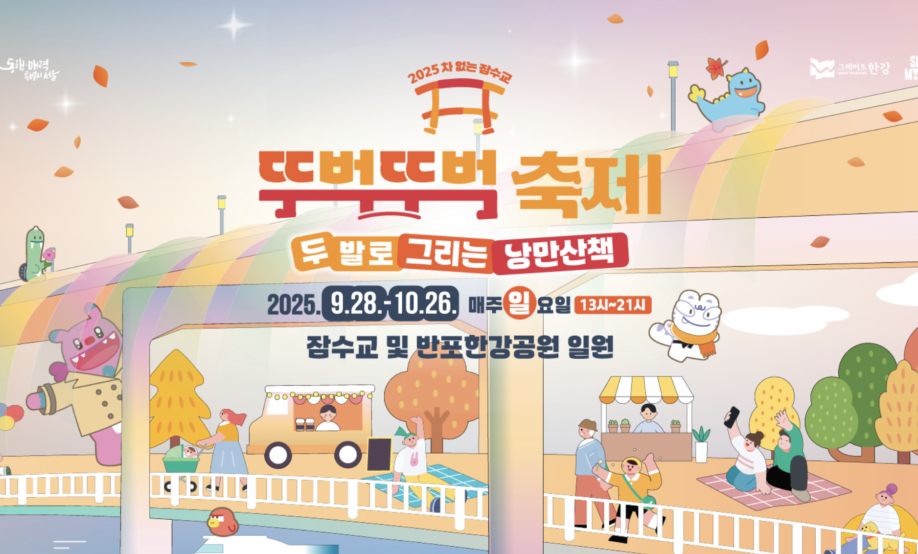 - 마지막으로 잠수교 포토존에서는 서울의 상징 캐릭터 해치와 함께 사진을 남길 수 있어 SNS 인증샷 명소로 자리잡고 있습니다.